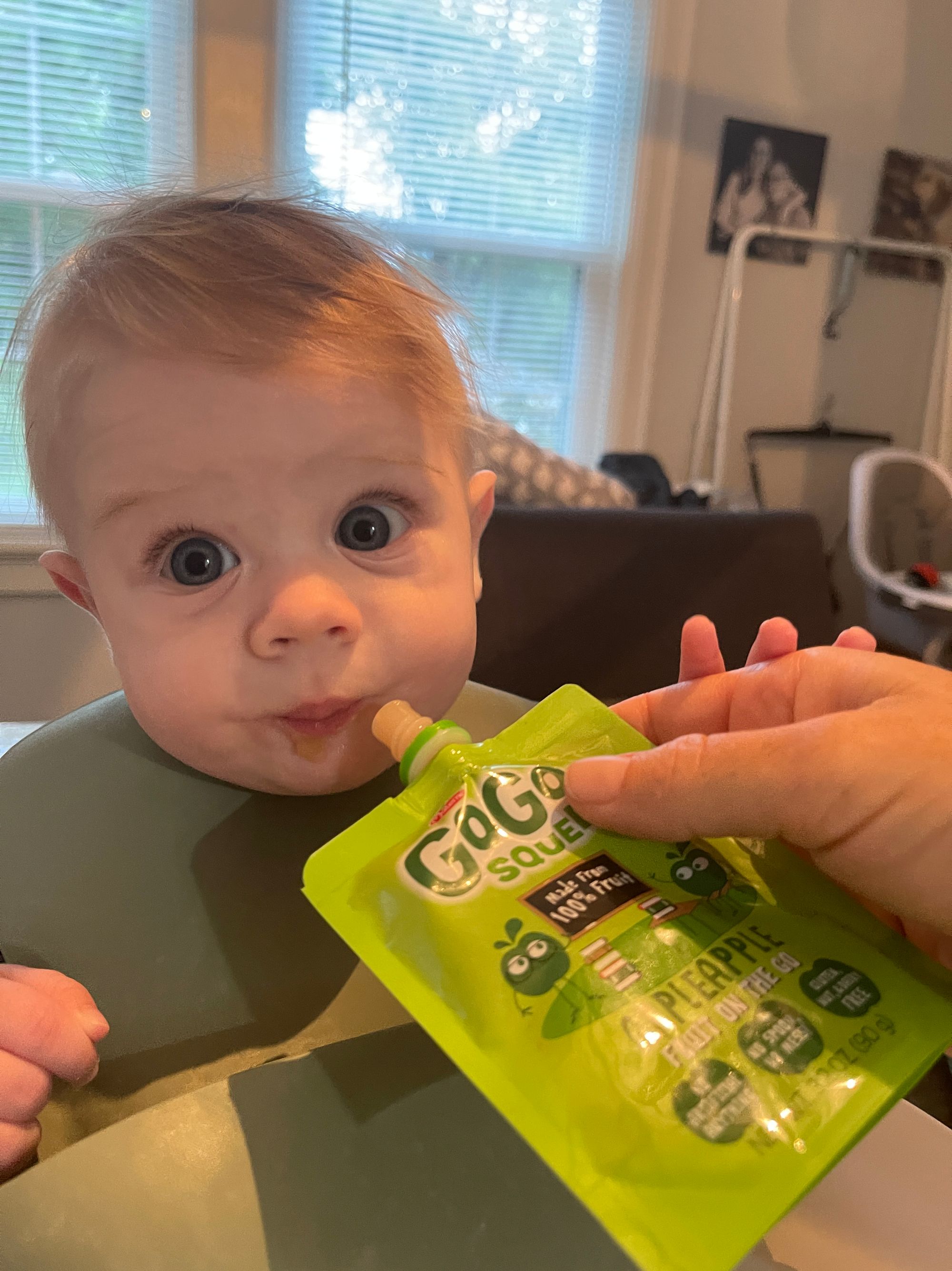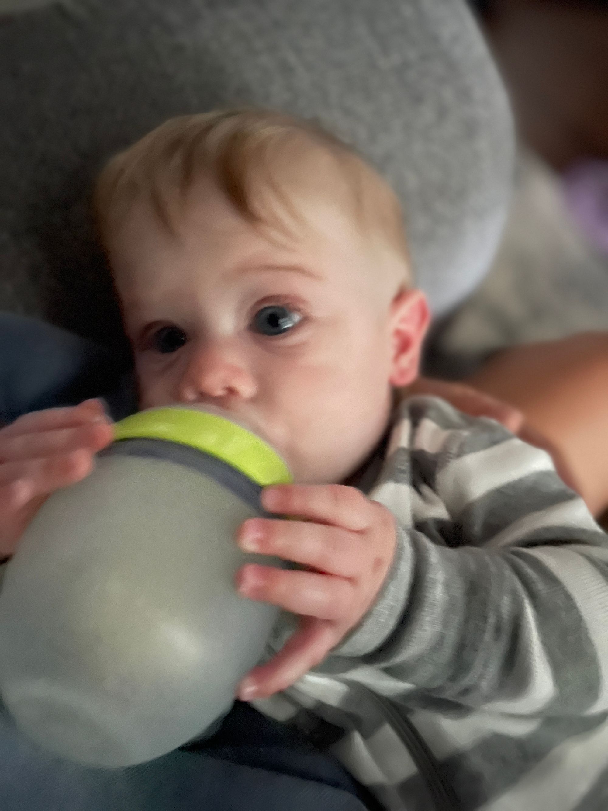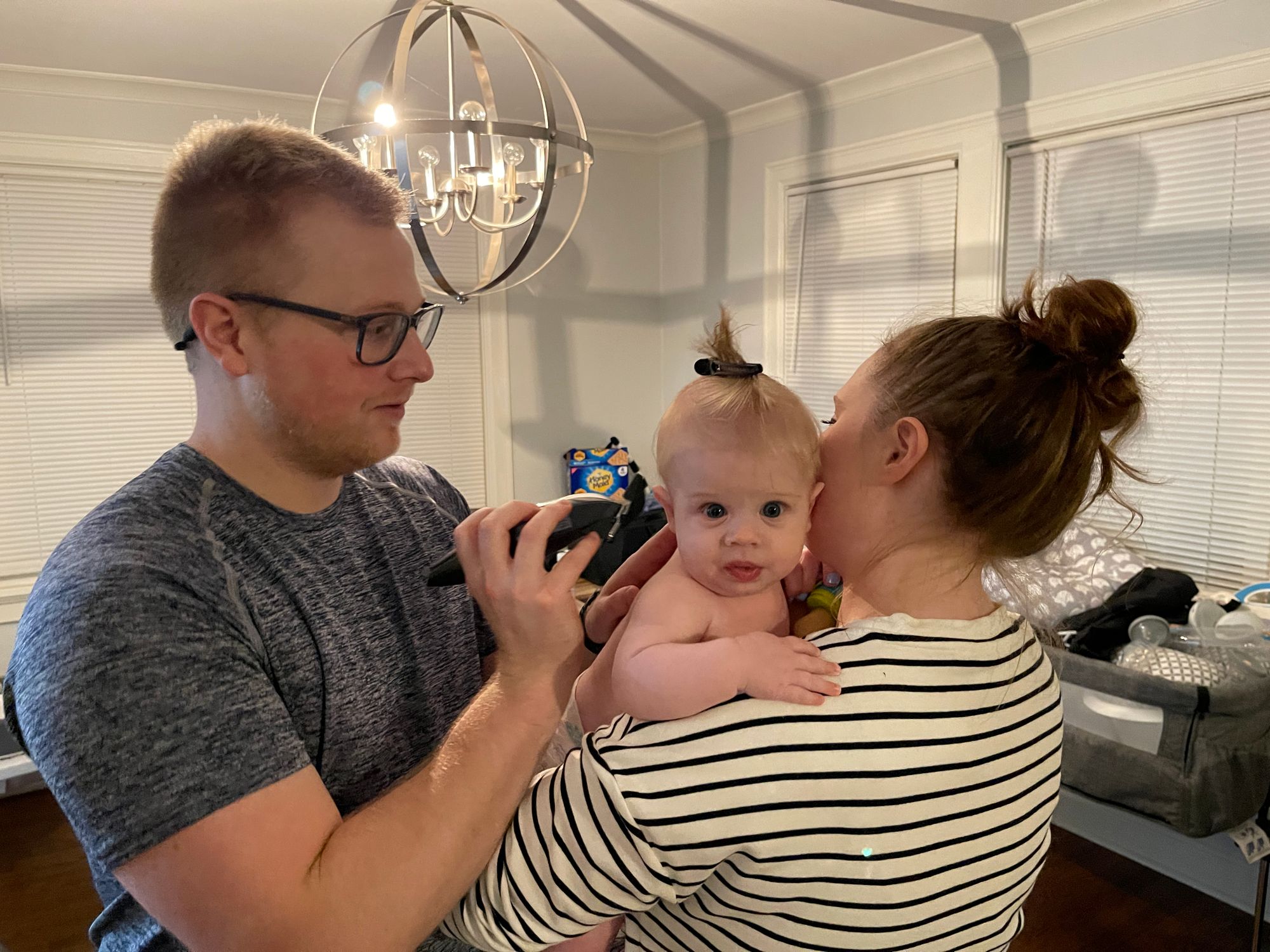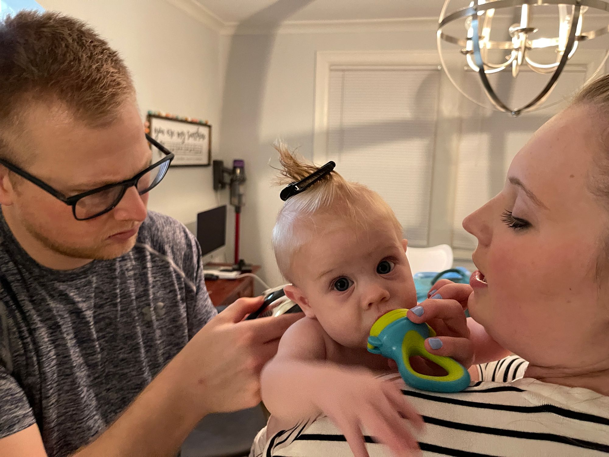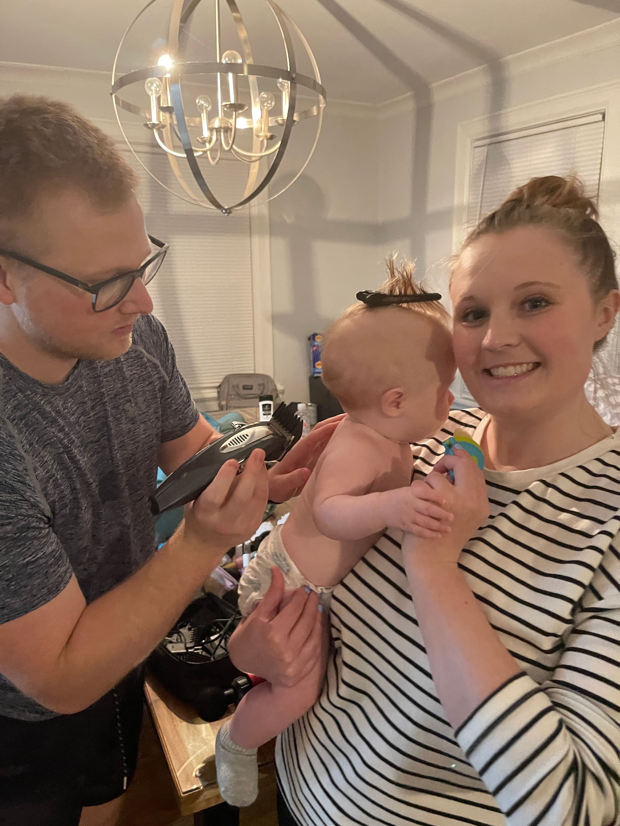 He gets his first haircut and enjoys a banana filled binki and then a bath :)