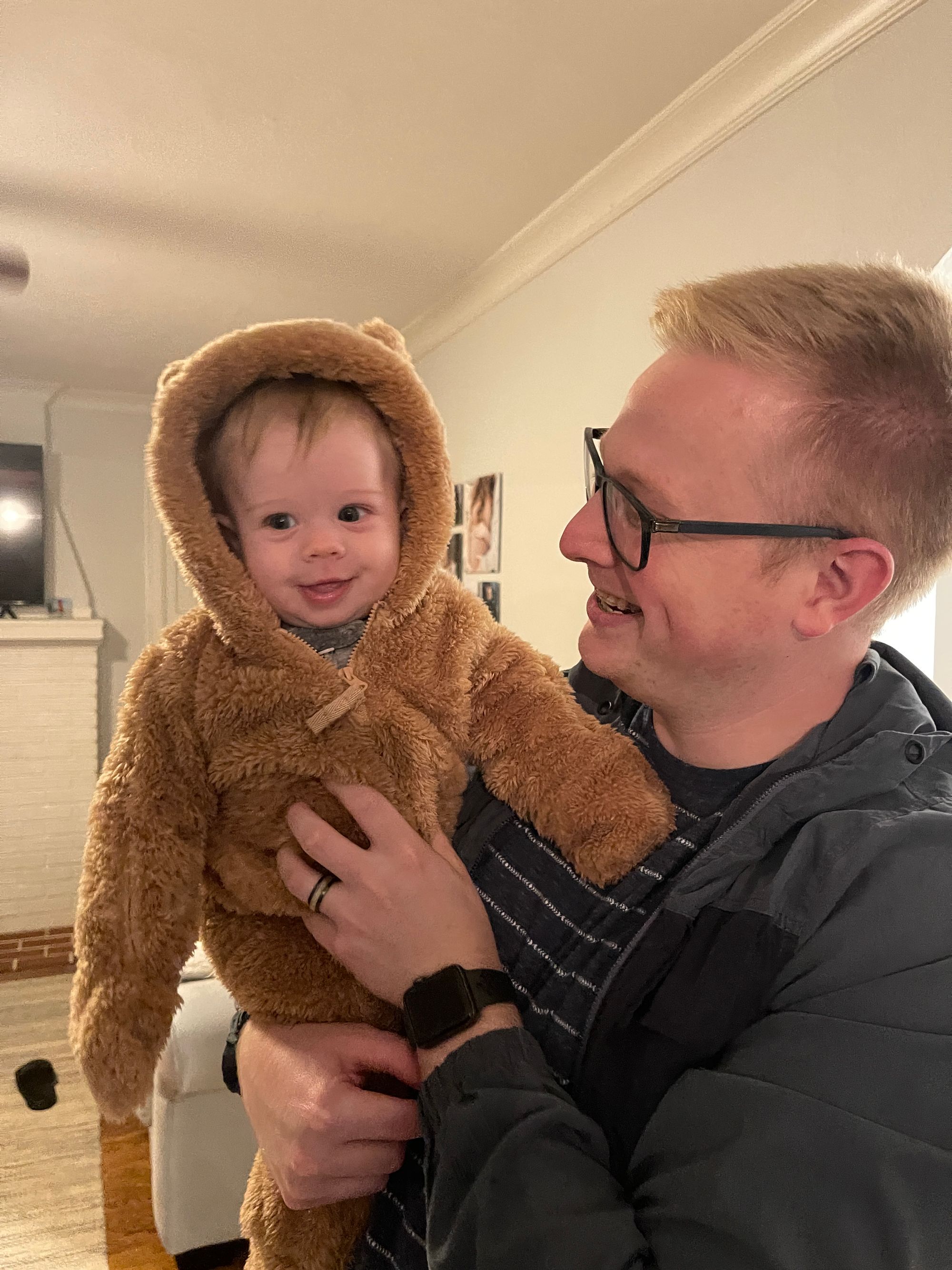 Benson loves going outside on walks. On this day it is colder and so he wears his bear suit!