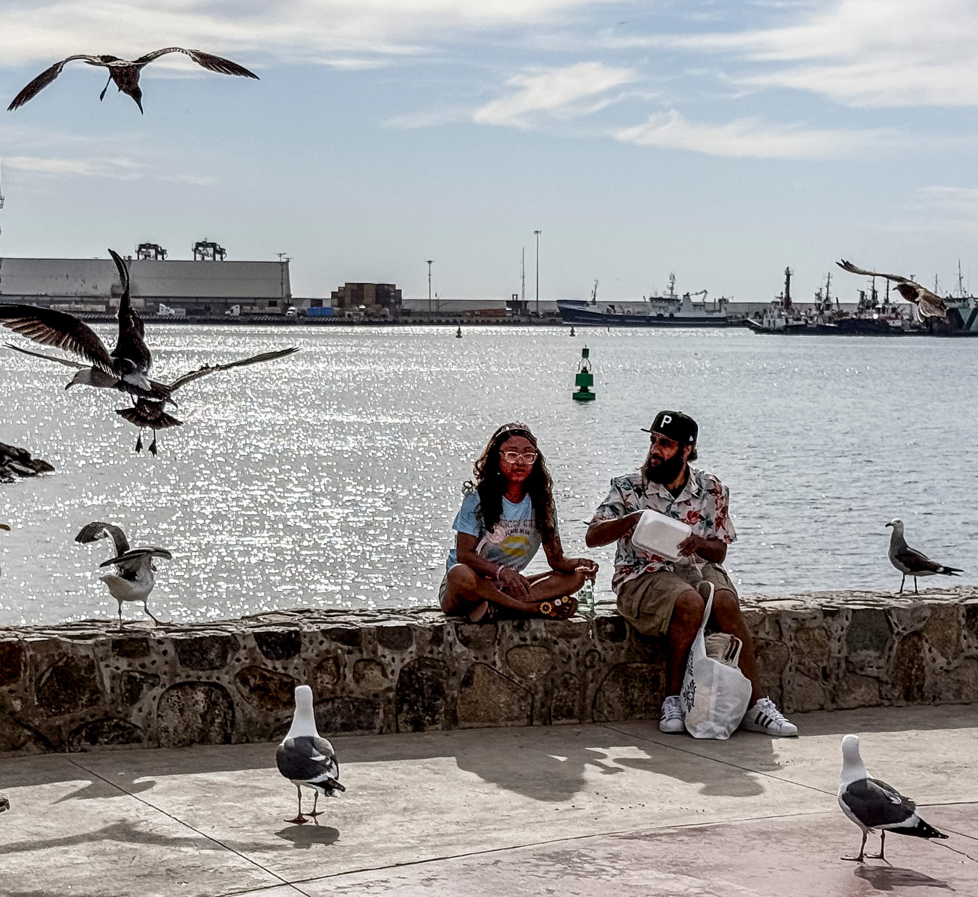 I enjoyed the sunlight and gentle stroll. This couple was eating some food and the seagulls were very interested!