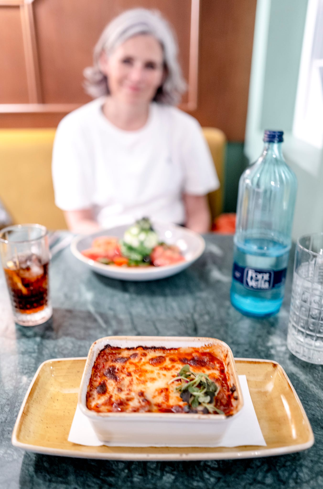 We went to Bella's for dinner. Olives for appetizers. The a tomato burrata salad. Lasagna.