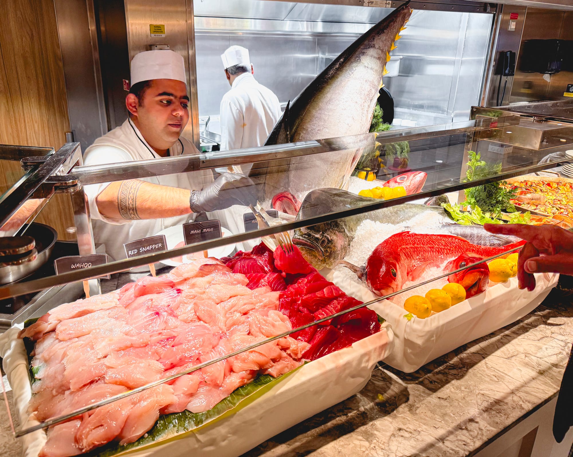 After leaving Bridgetown we had a sea day. That night the buffet had this amazing spread of fresh fish. They had a yellow tail tuna in there. It was huge, I've never seen a real tuna before, just videos of these things. Most impressive buffet ever seen on a ship, or not on a ship. Oceania delivers.
