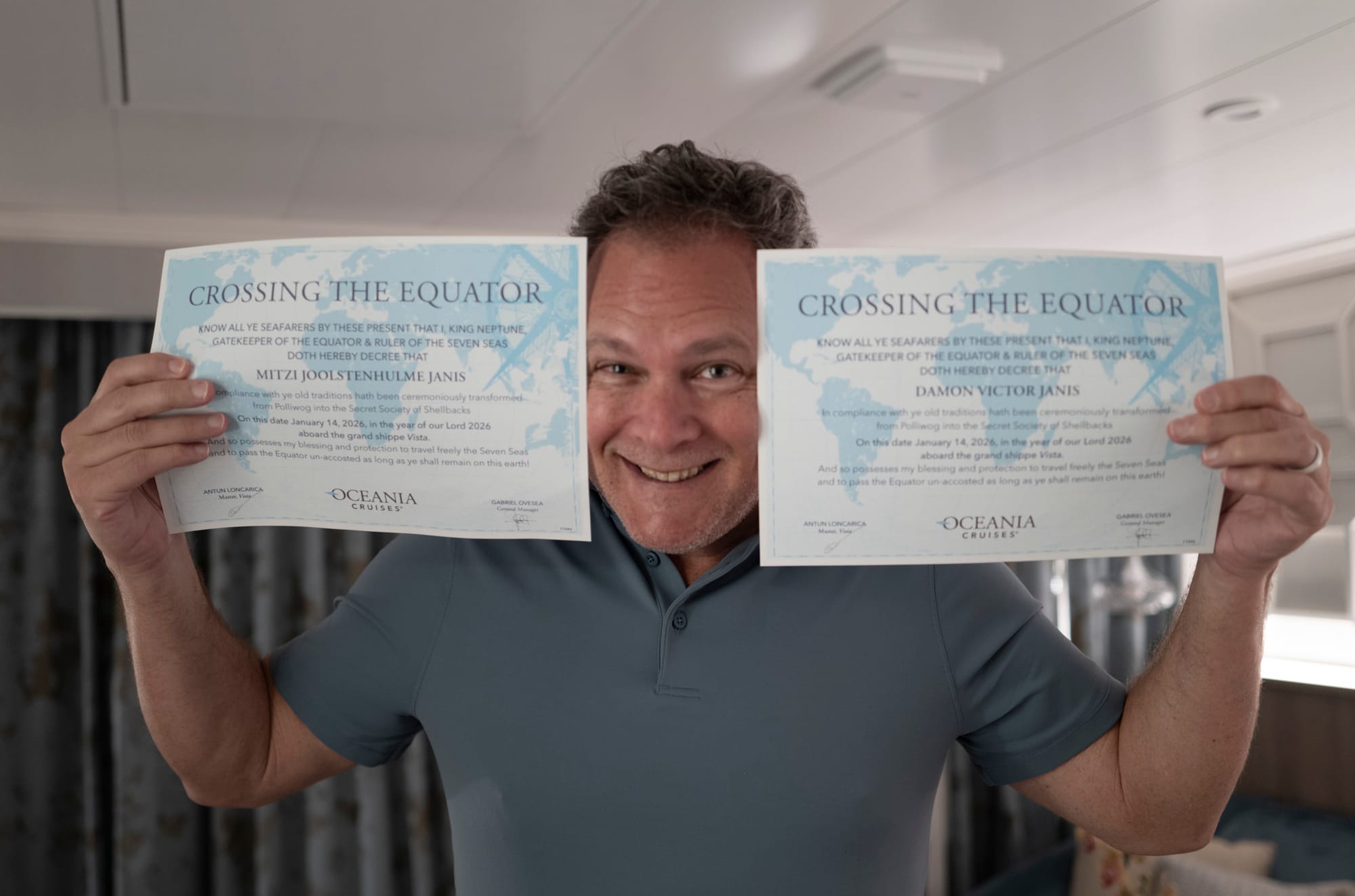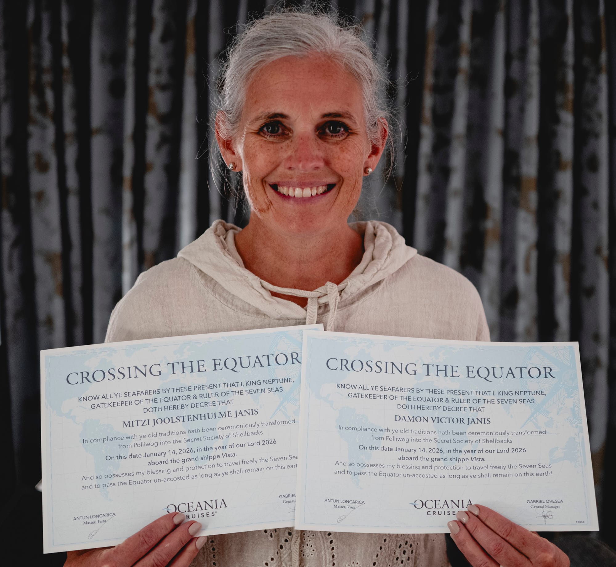 We had a nice lunch and later that evening they delivered certificates to use for crossing the Equator. This was Mitzi's fourth time crossing, first time on a ship. This was my third time, first time on a ship.