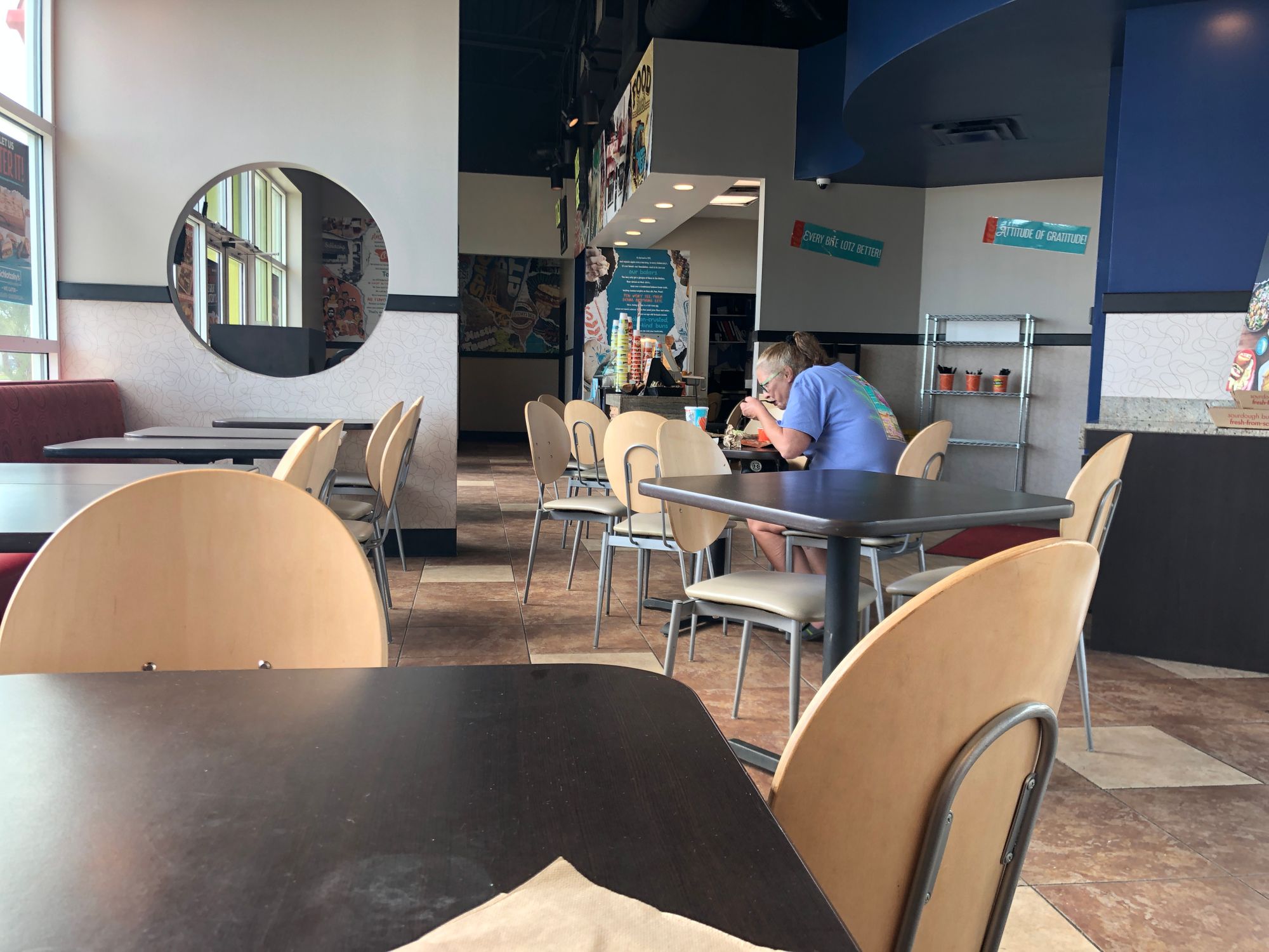 This funny scenario played out while I was grabbing a little sandwich at Schlotzsky's for old-times sake. An oldish man and woman were eating lunch together. They were about half done and the woman told the man to go home, that she would finish lunch, and would catch up with him later. He agreed and walked out the door. The second he was out the door she switched seats to where he was sitting and hastily began eating his leftovers.