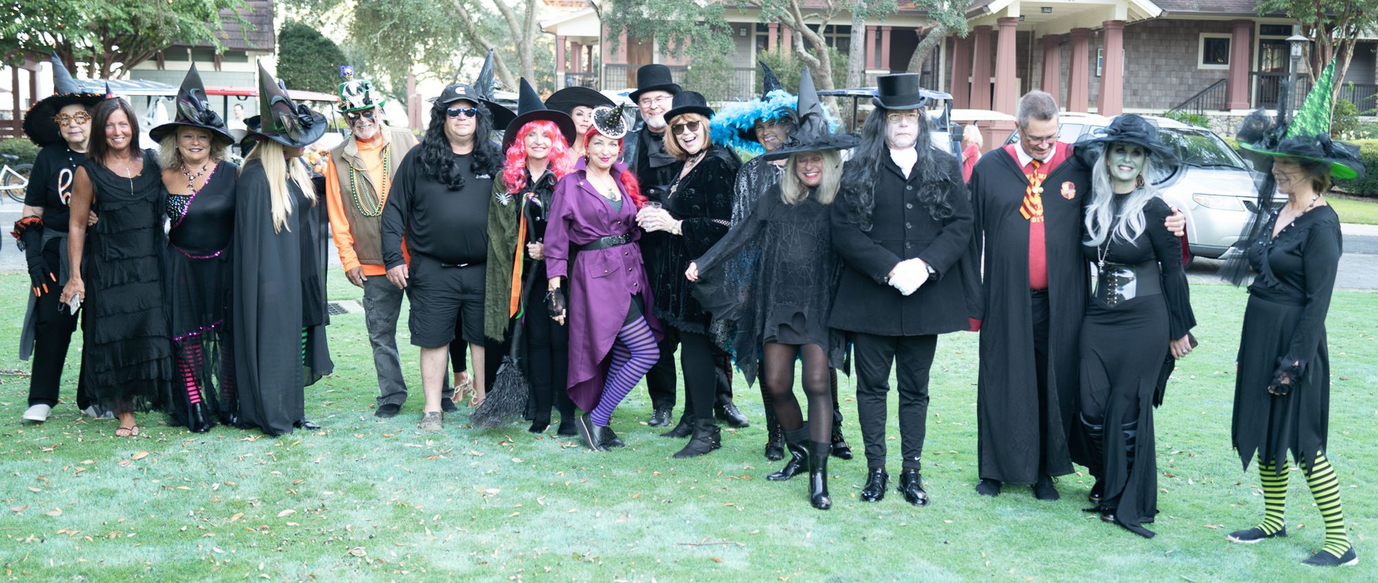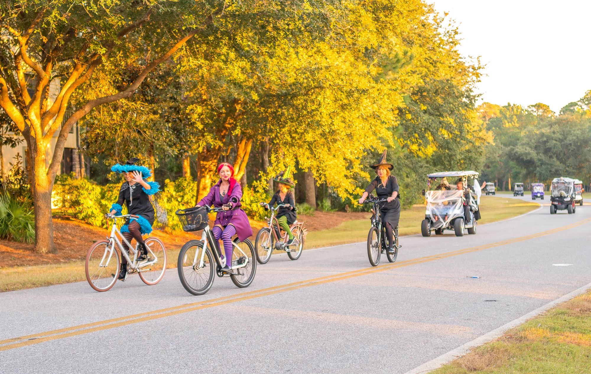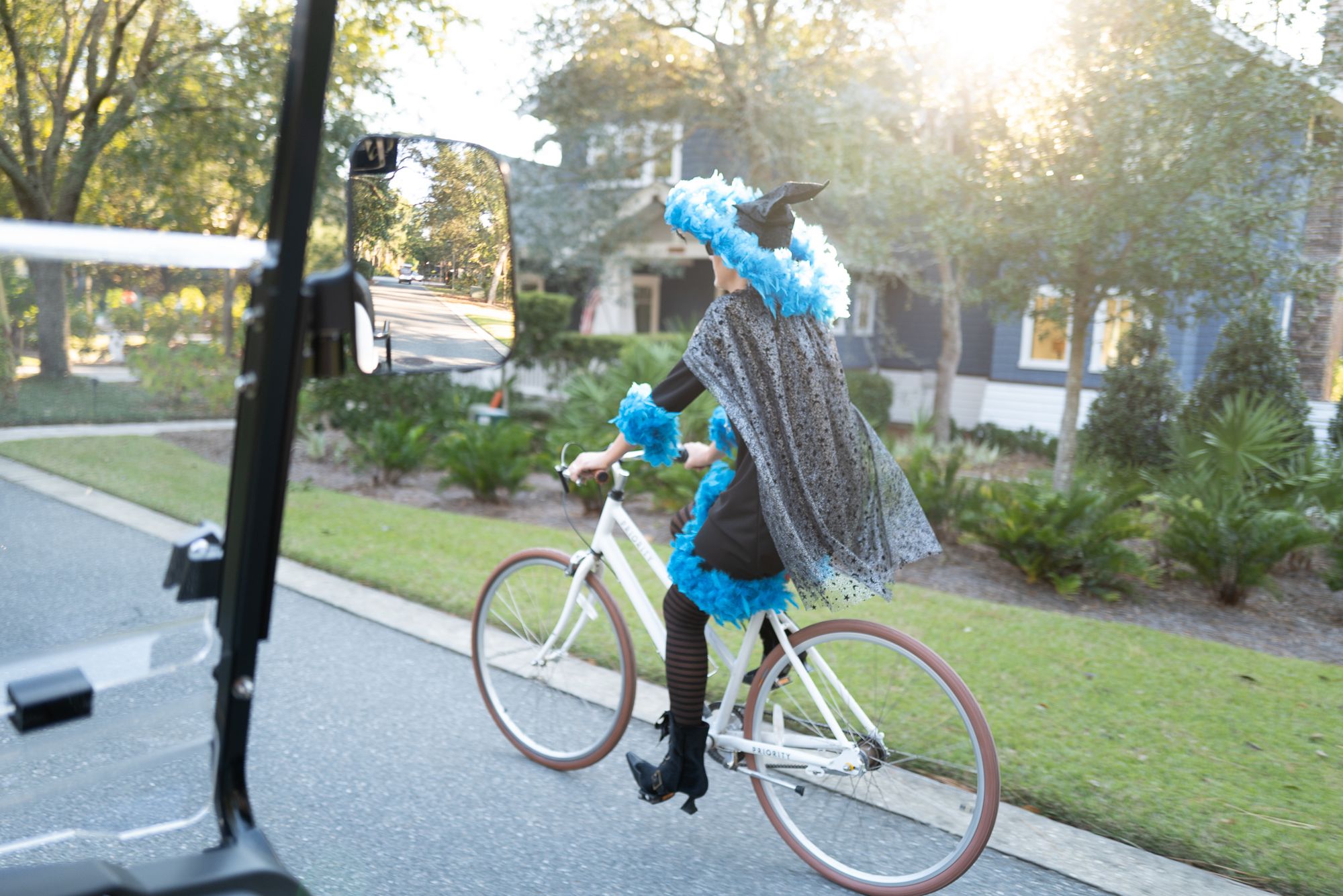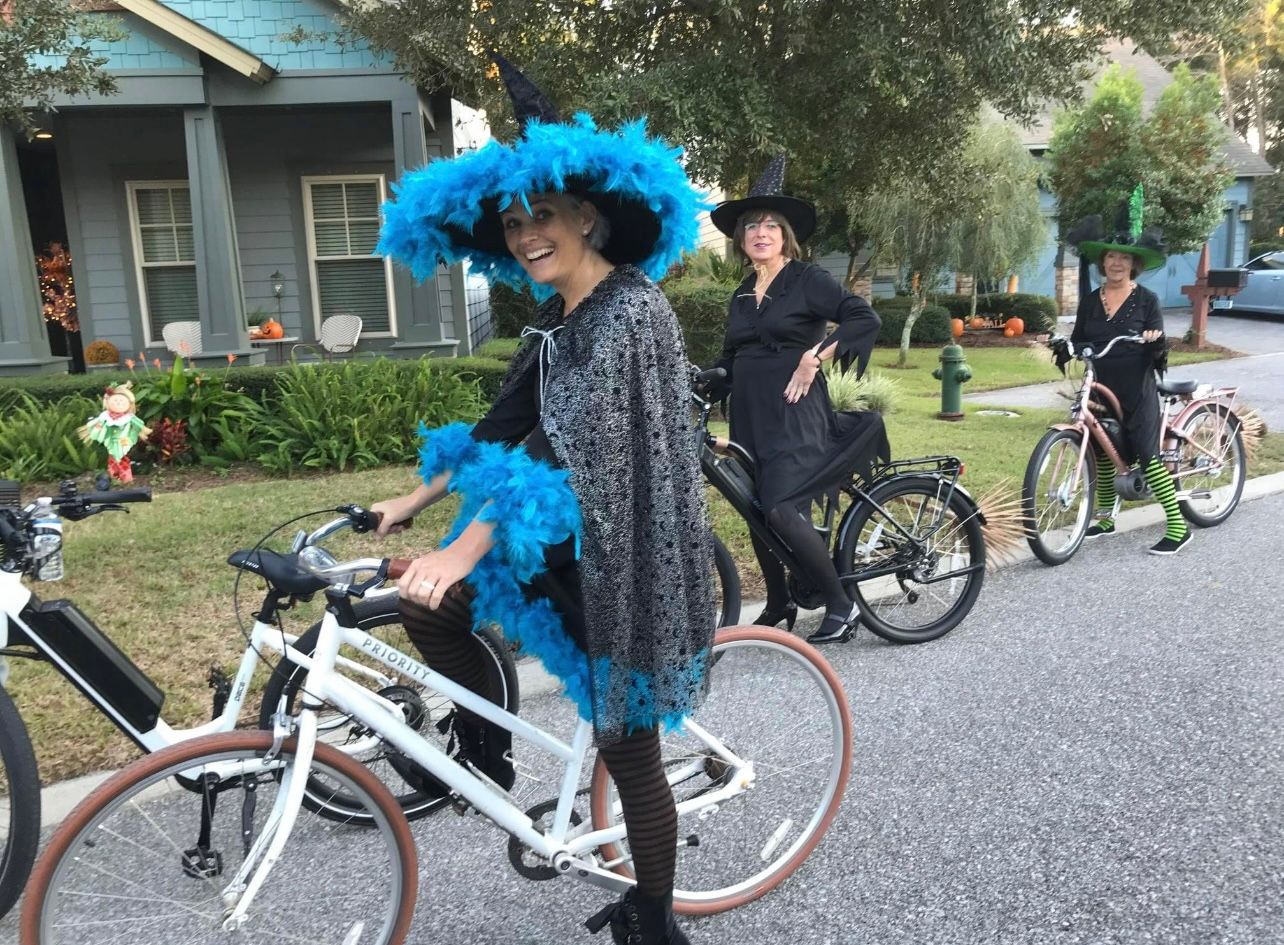 The following day a witch ride was planned through the neighborhood. I was under the impression this was for women and we would all be on bikes. Hahaha..... NOPE! There were plenty of men and most people drove their decorated golf carts! Damon was super kind to come along and take pictures of us :)