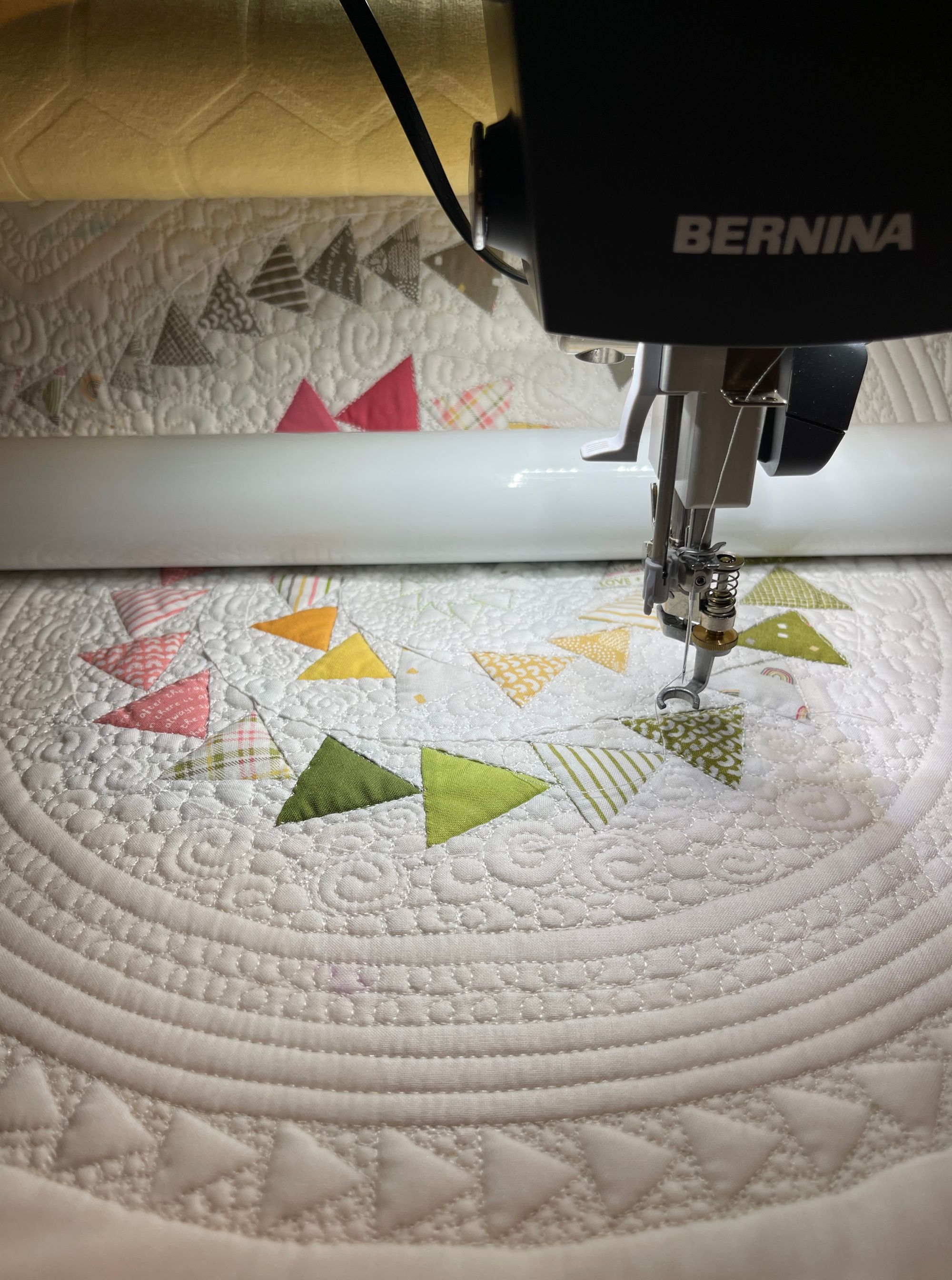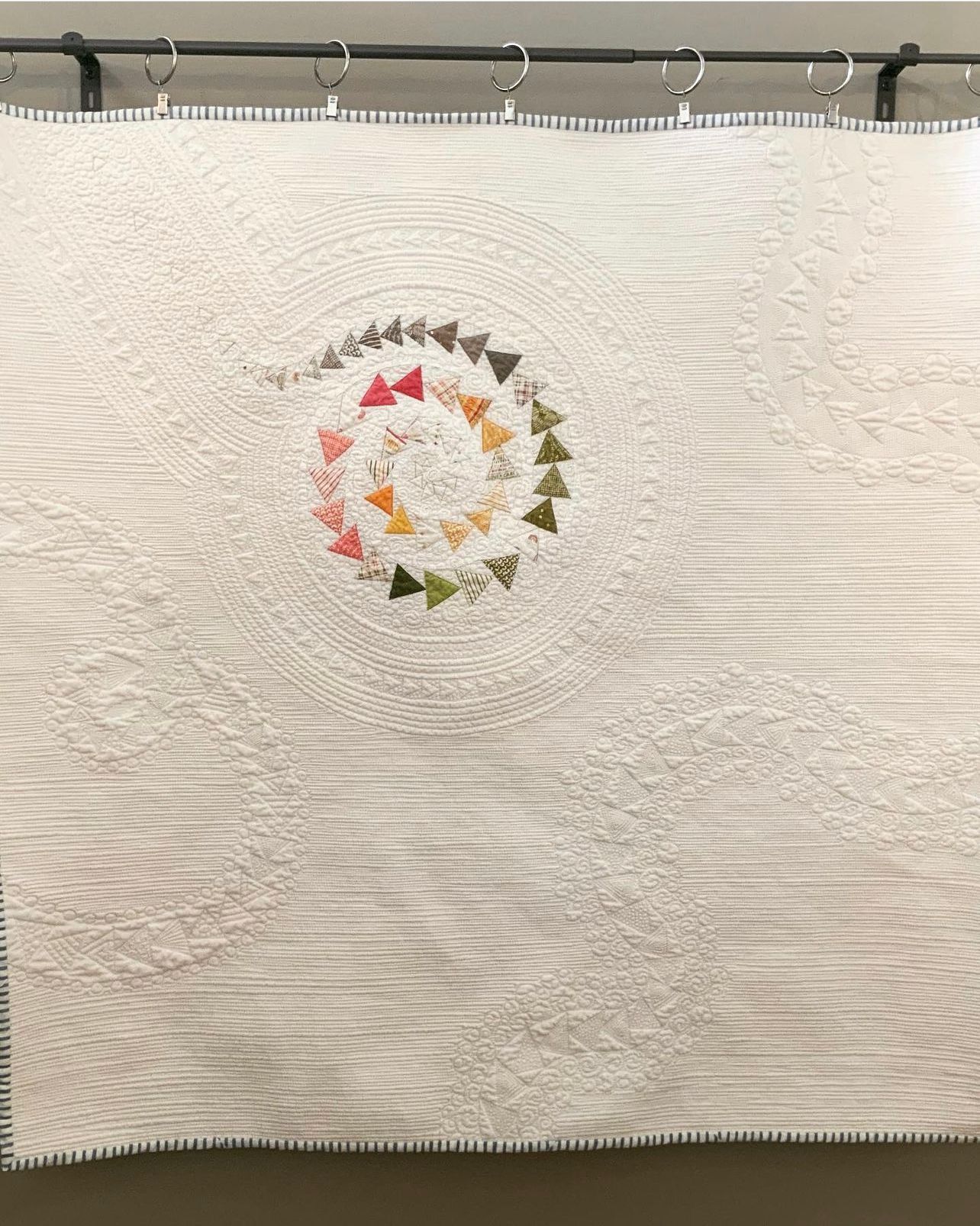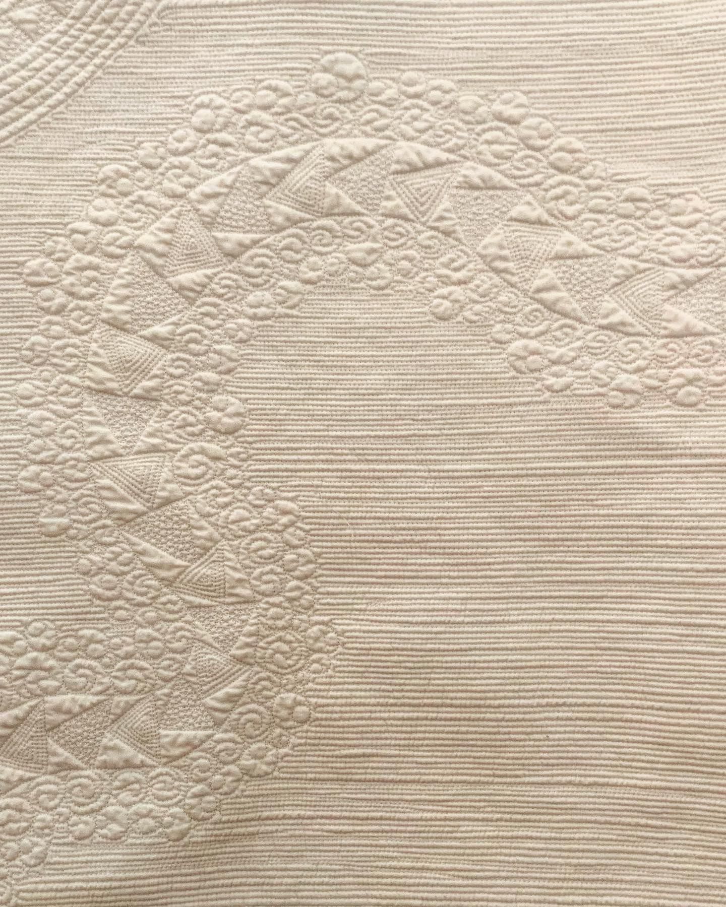 I finished a Whole Cloth Master Piece. This quilt was a new adventure on so many technical levels. Paper pieced flying geese, Hand stitched positive space inlay, and lots of creative flying geese free quilting. I love it and am very proud of It!