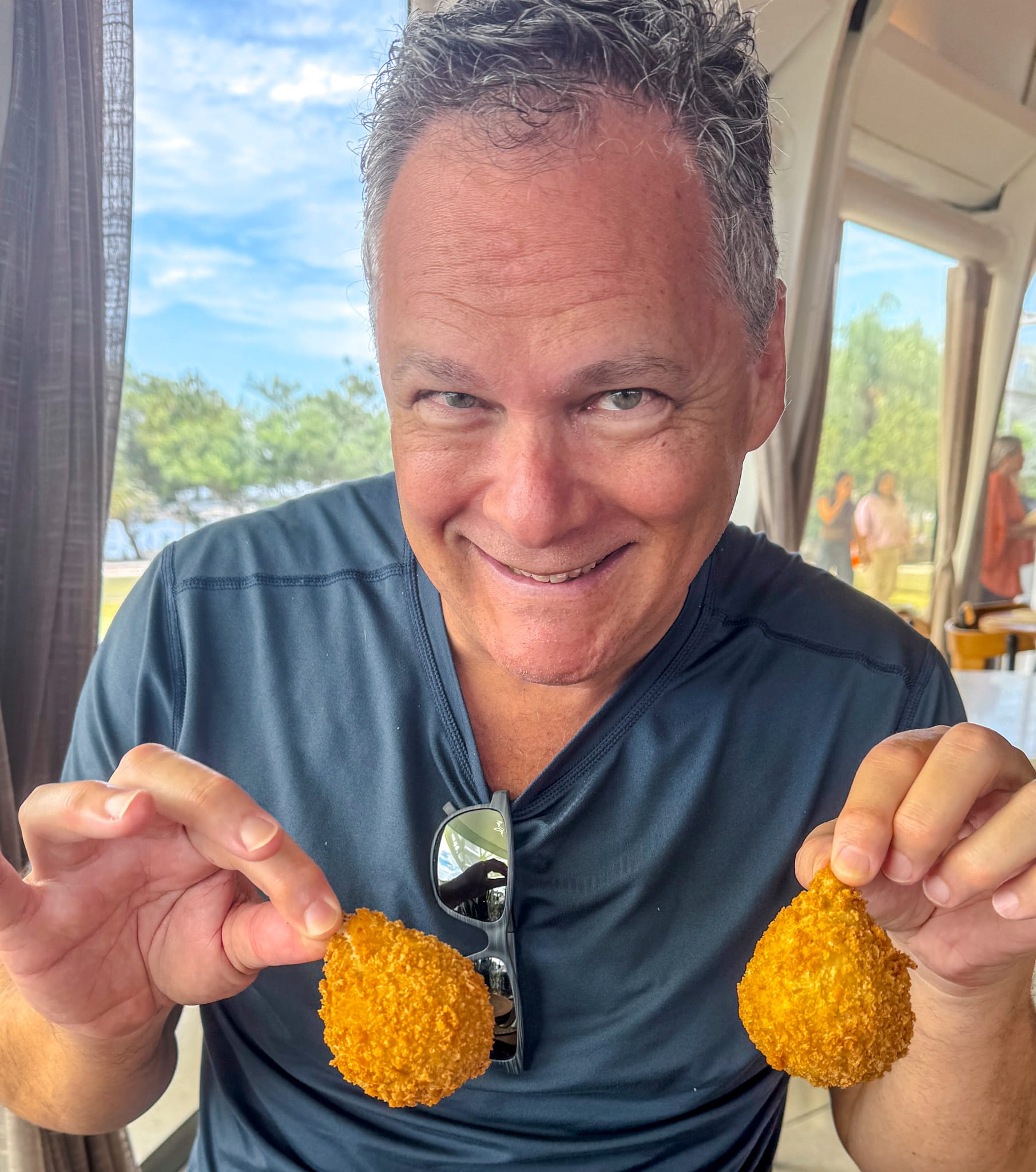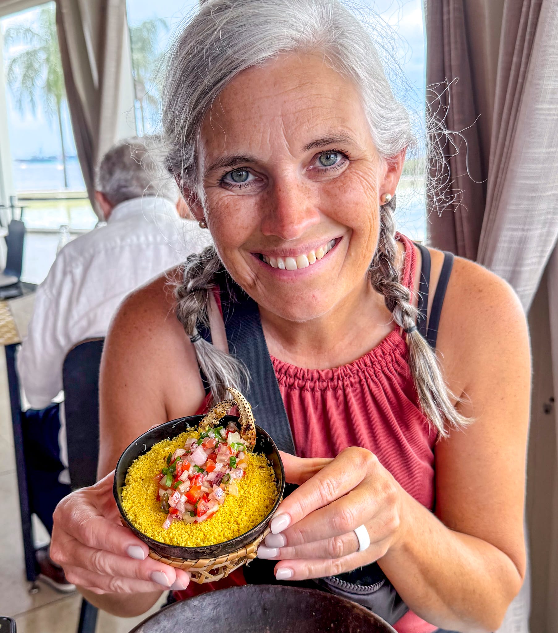 I got 2 crab coxinha's, Mitzi got a crab farinha bowl and a burrata salad.