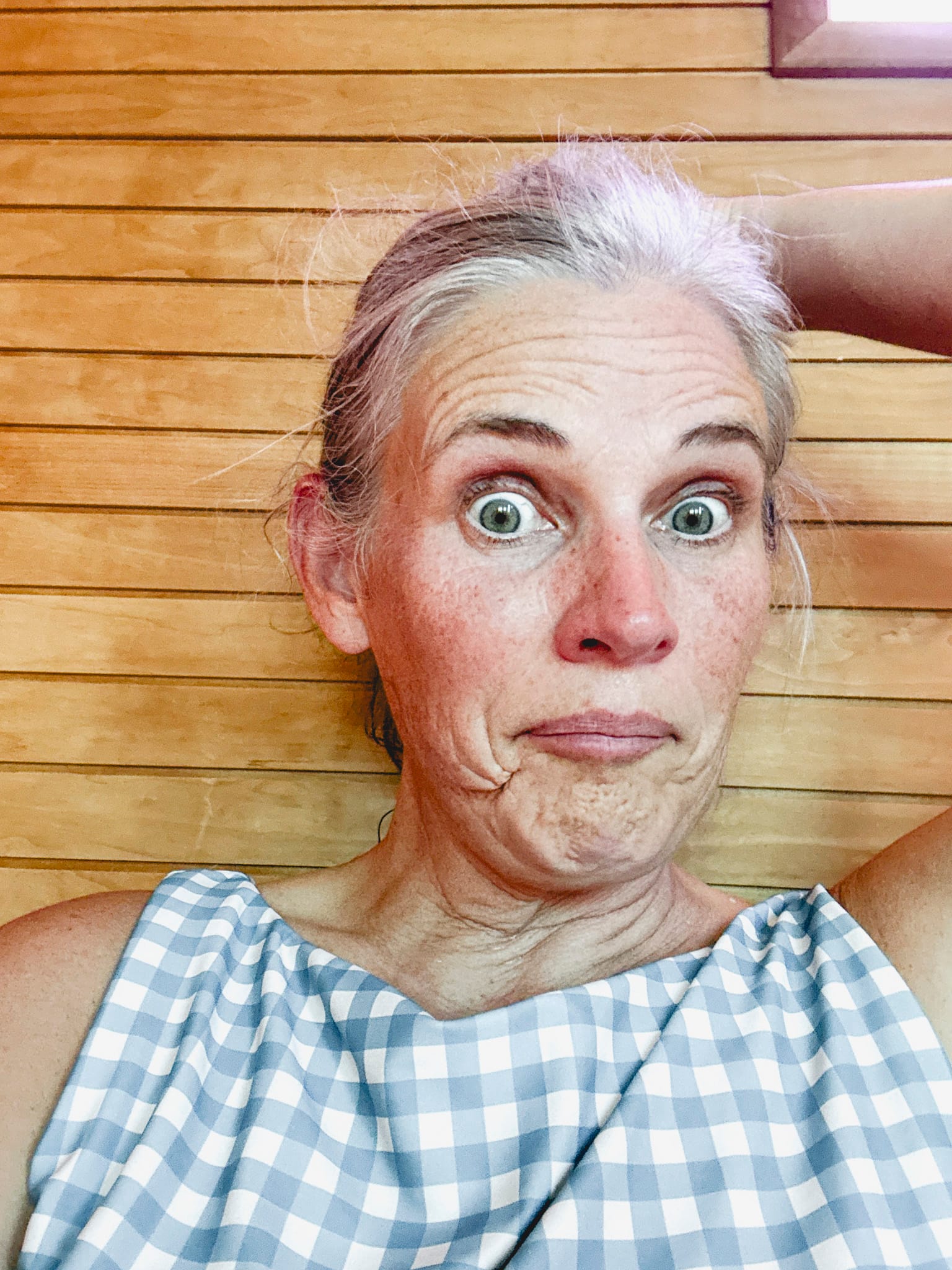 Mitzi's teeth are very sore because of the clear aligners she is wearing. Hence her sad face at not being able to eat the crust on the bread, her first meal on the ship.