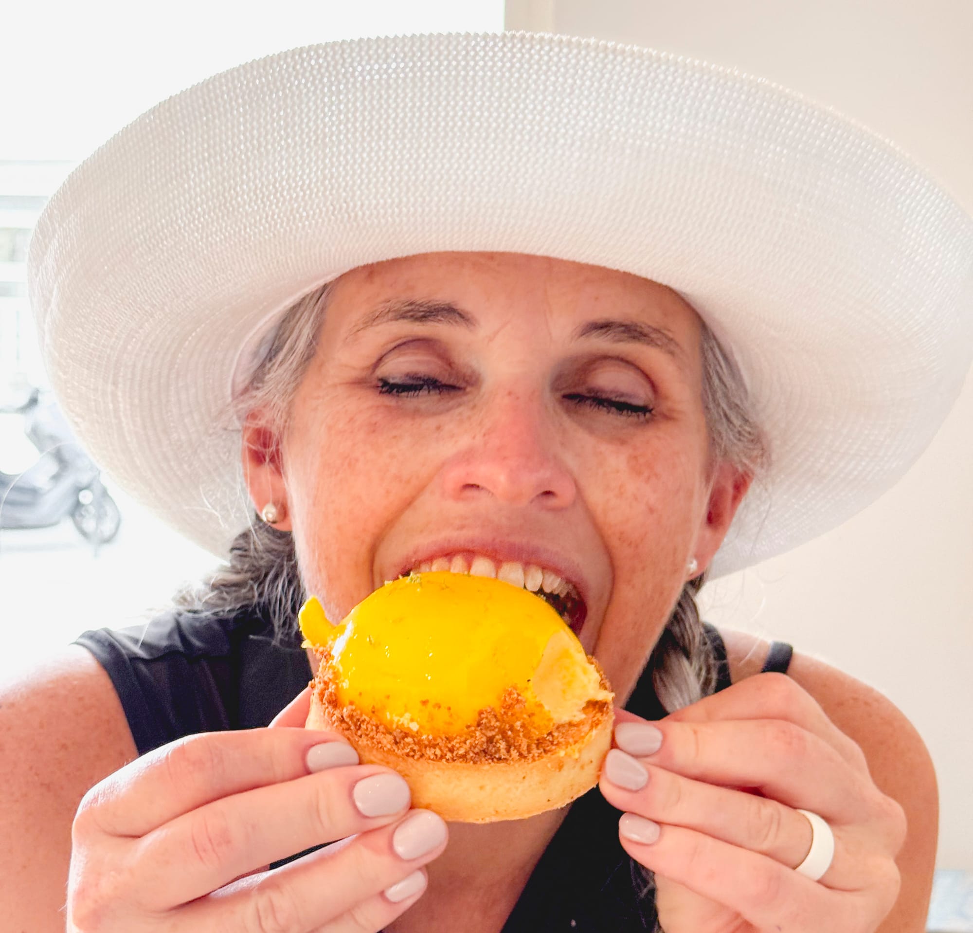 We walked through the port area in Gustavia and did some shopping. Mitzi bought a "tarte au citron (lemon tart)". I'm not eating carbs since mid November to improve metabolic health, hence my expression of fear. Mitzi enjoyed it thoroughly.